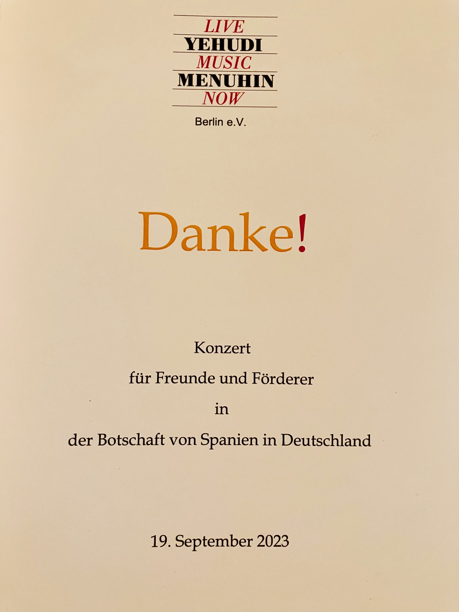Herzlichen Dank an Philipp Schupelius und Simon Haje für dieses unvergessliche Konzerterlebnis, herzlichen Dank an seine Exzellenz den Botschafter von Spanien, Ricardo Martinez sowie den Gesandten Spaniens Herrn Luis de Colmenares für die Gastfreundschaft und herzlichen Dank an alle Unterstützer von Yehudi Menuhin Live Music Now e.V. für ihre Spende!